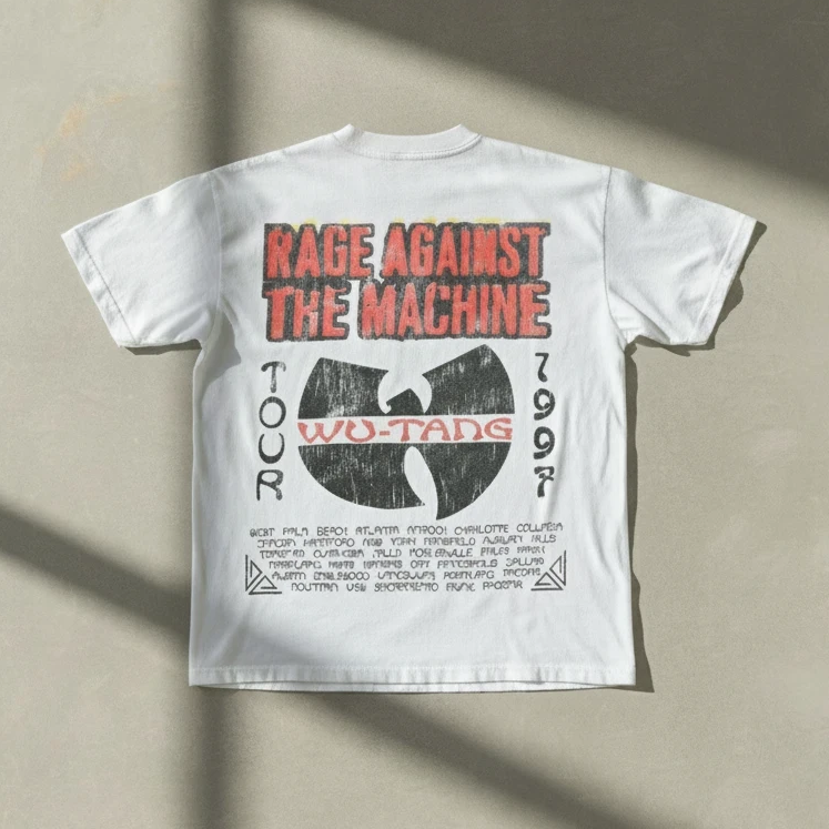 Show off your love for legendary hip-hop and rock with this rare white t-shirt from the epic 1997 RATM x Wu-Tang tour. Perfect for fans who want to stand out, this tee blends iconic style with a dash of vintage cool. Rock it loud, rock it proud!